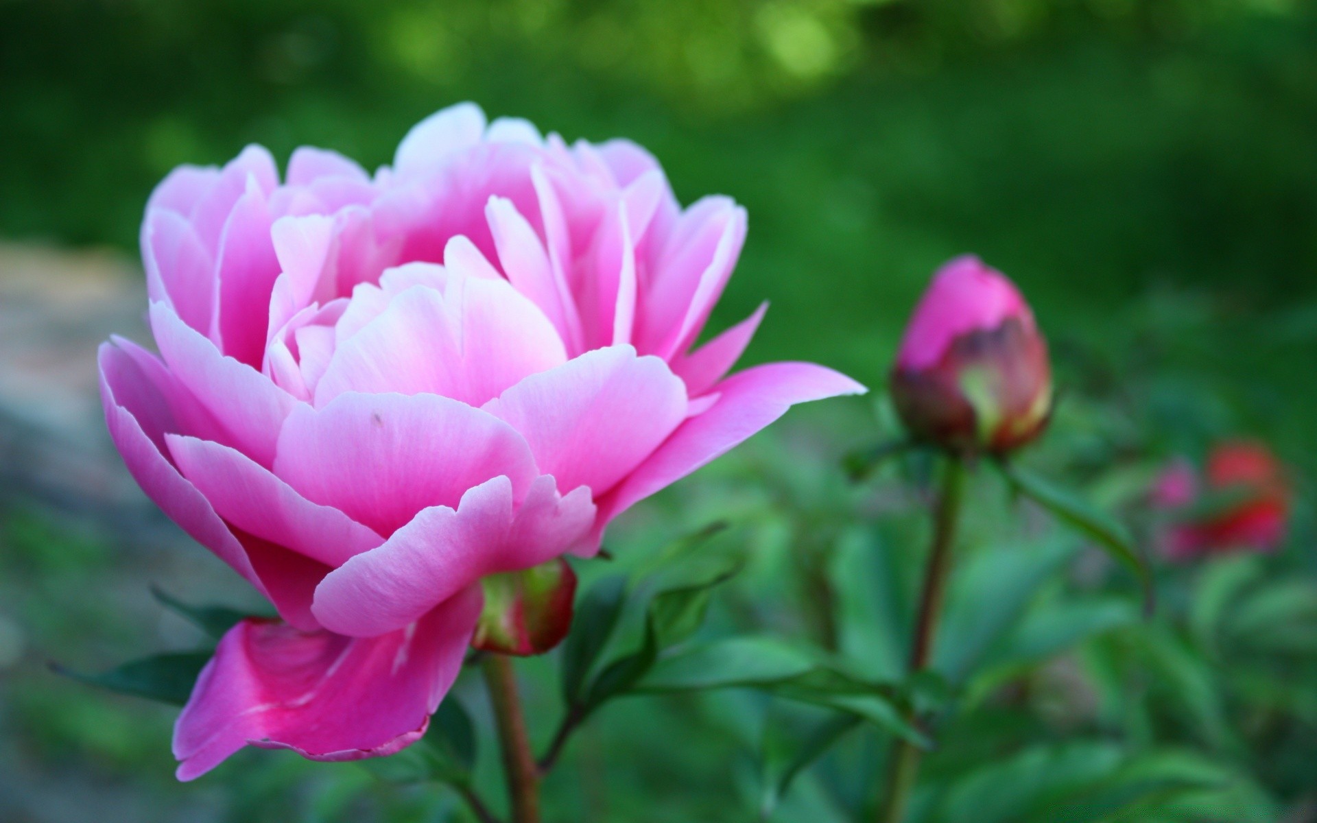 Peonia rosa in fiore con bocciolo su sfondo verde