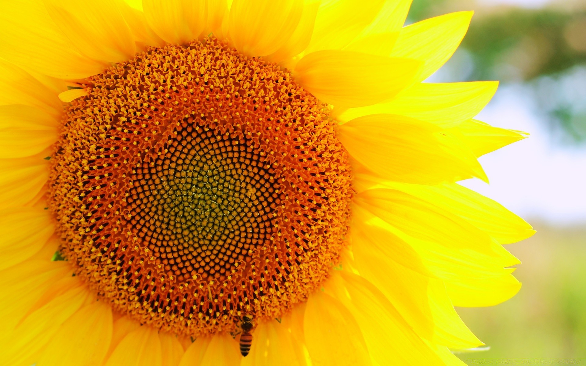 Giovane girasole con un'ape. Estate e natura