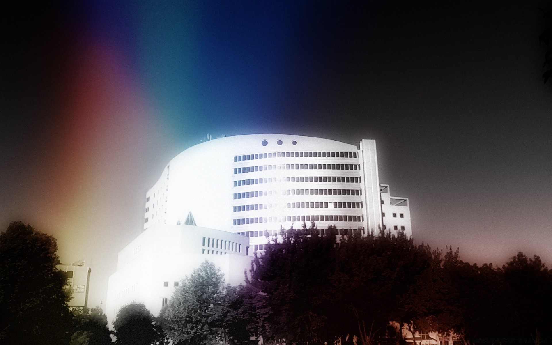 Sagoma di edifici futuristici sullo sfondo di un tramonto infuocato