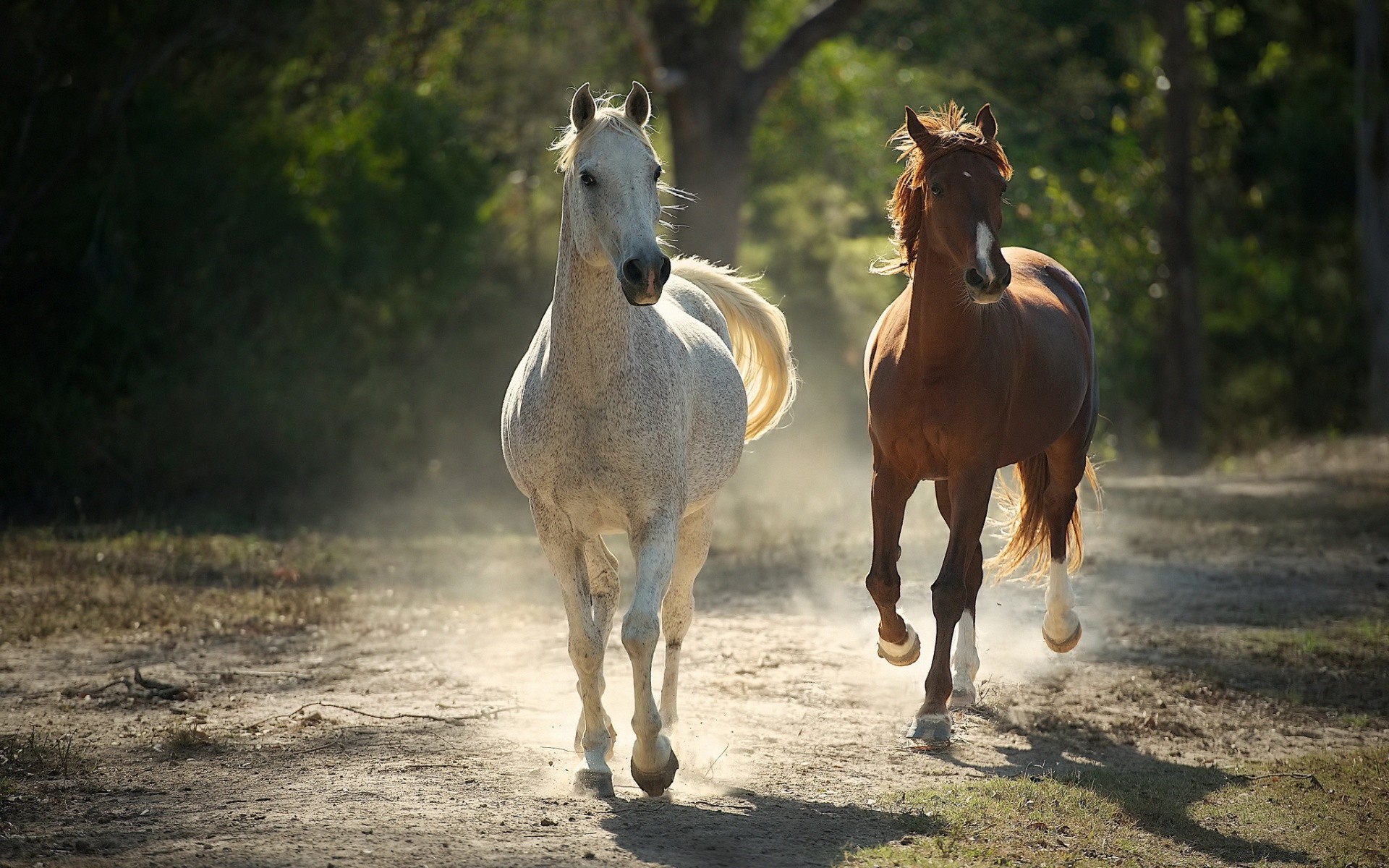 Cavalli bianchi e rossi che corrono lungo il sentiero della foresta