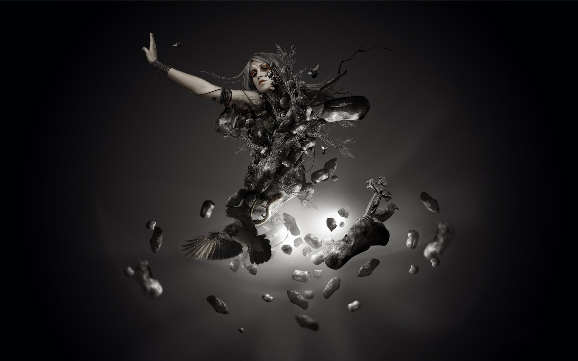 Illustrazione scura dell'astrazione della ragazza e degli uccelli