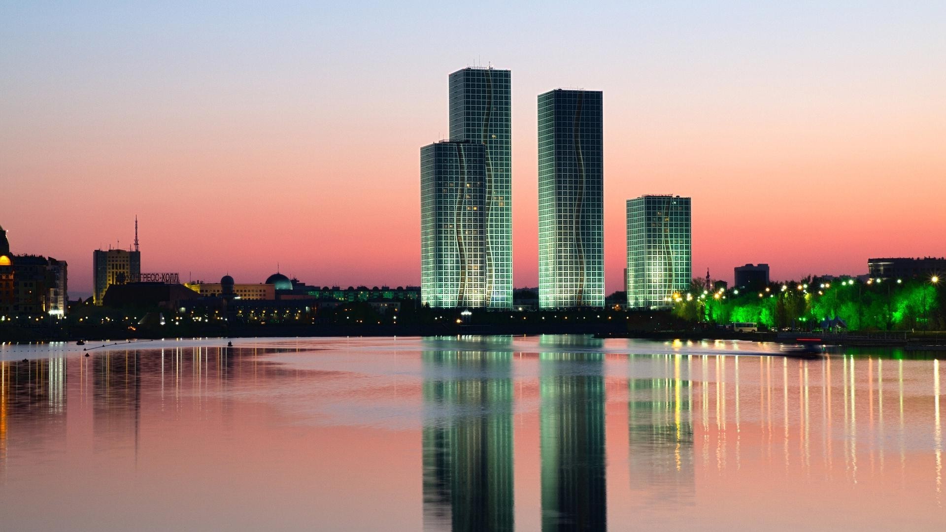 Grattacieli in riva al mare di notte. Architettura urbana moderna