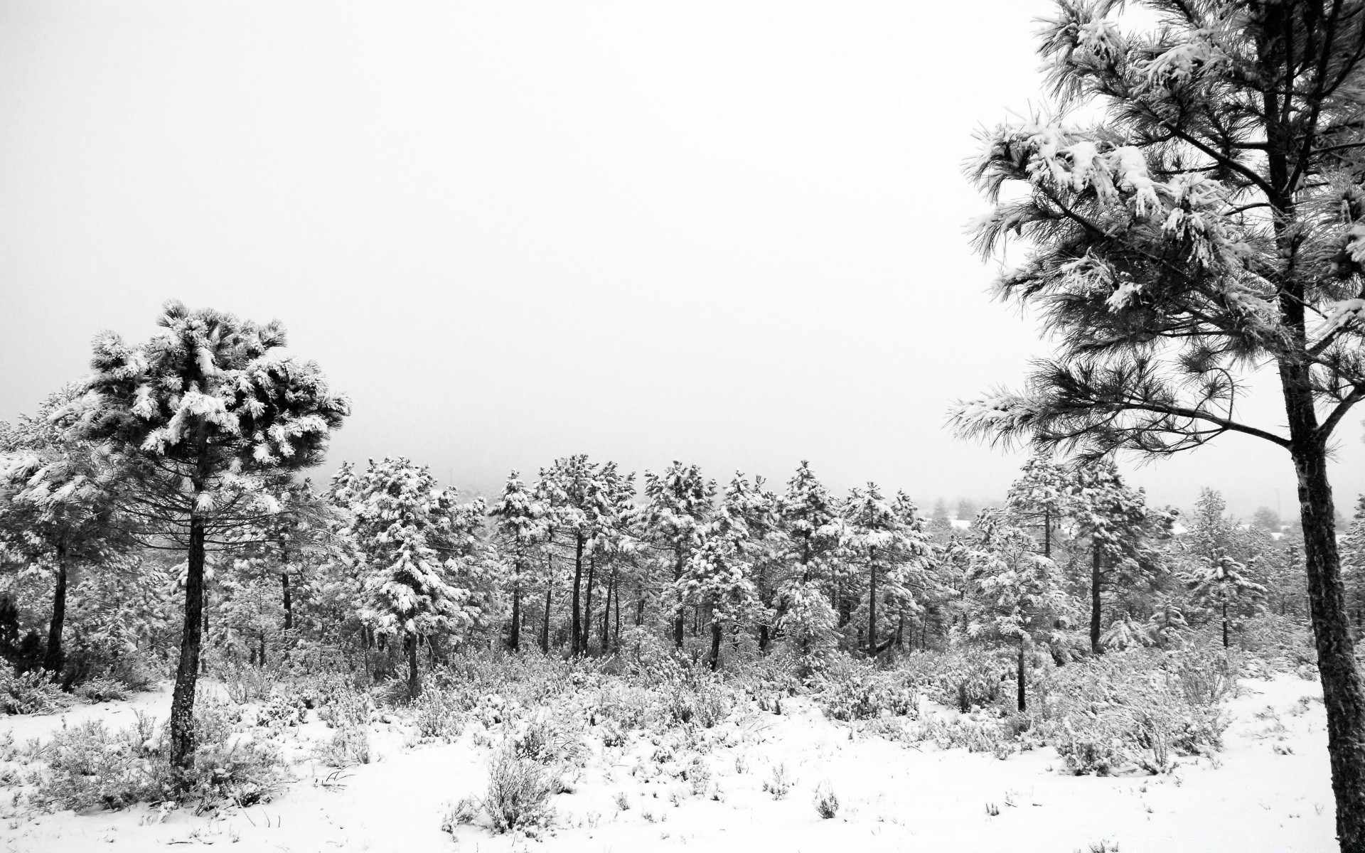 Foresta innevata con radura nei toni del grigio