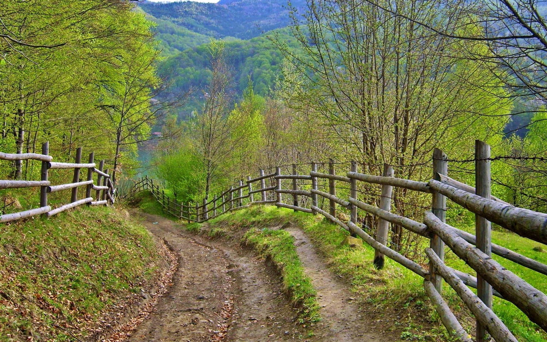 Strada stretta tra grandi alberi verdi
