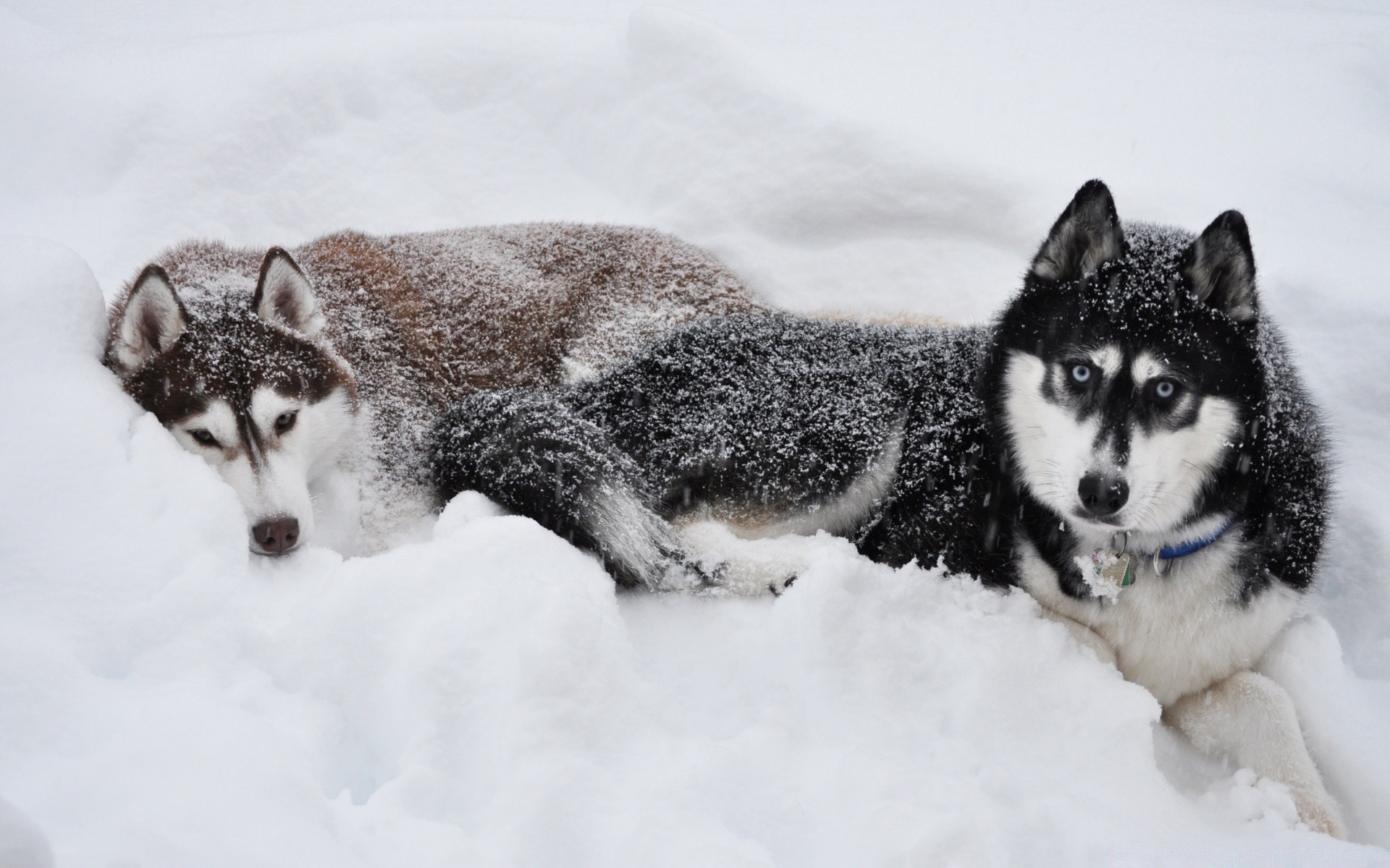 Immagine di un cane di razza Husky con un gatto su un plaid
