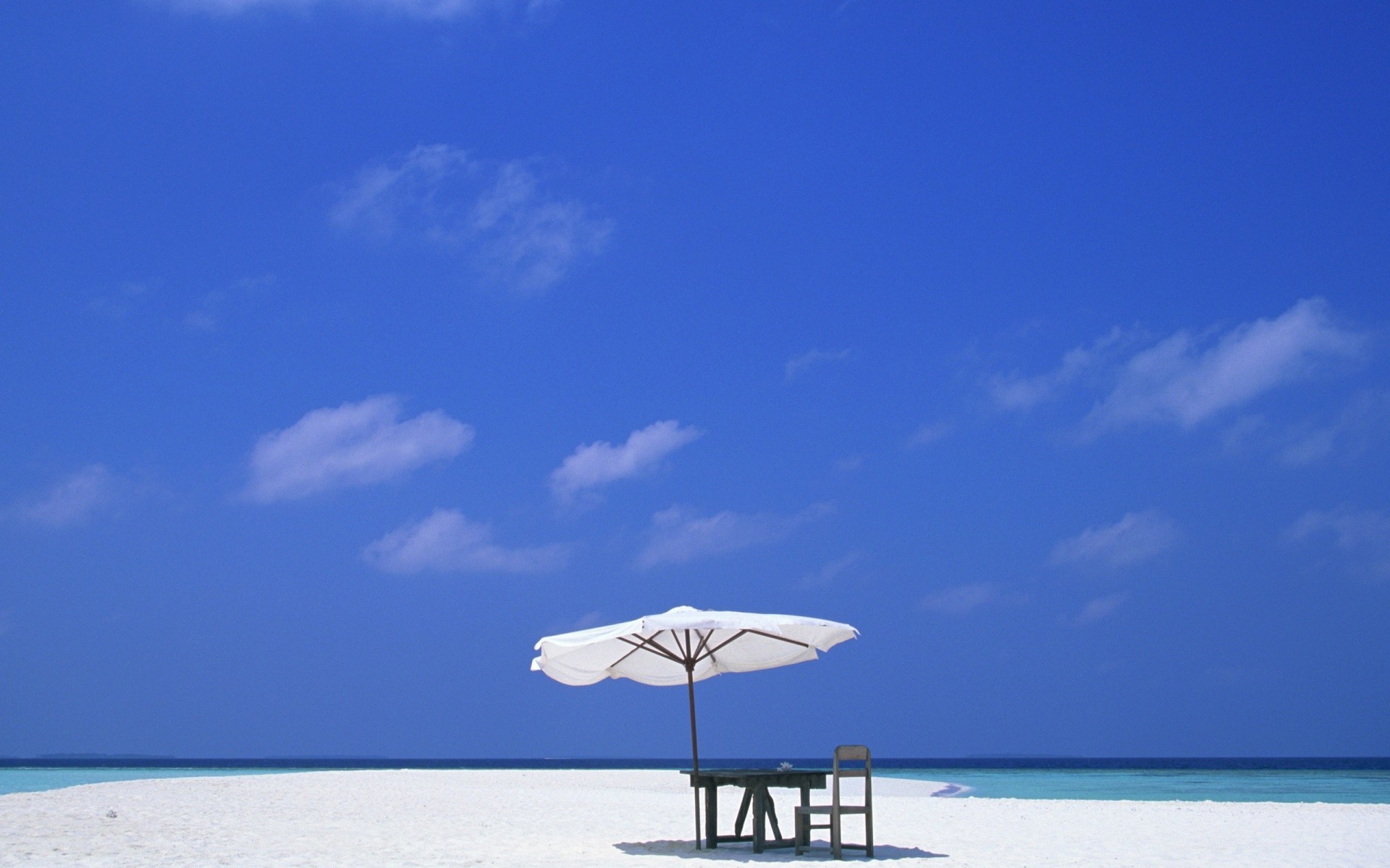Tavolo romantico su una spiaggia deserta con sabbia bianca e mare bluTavolo romantico su una spiaggia deserta con sabbia bianca e mare blu