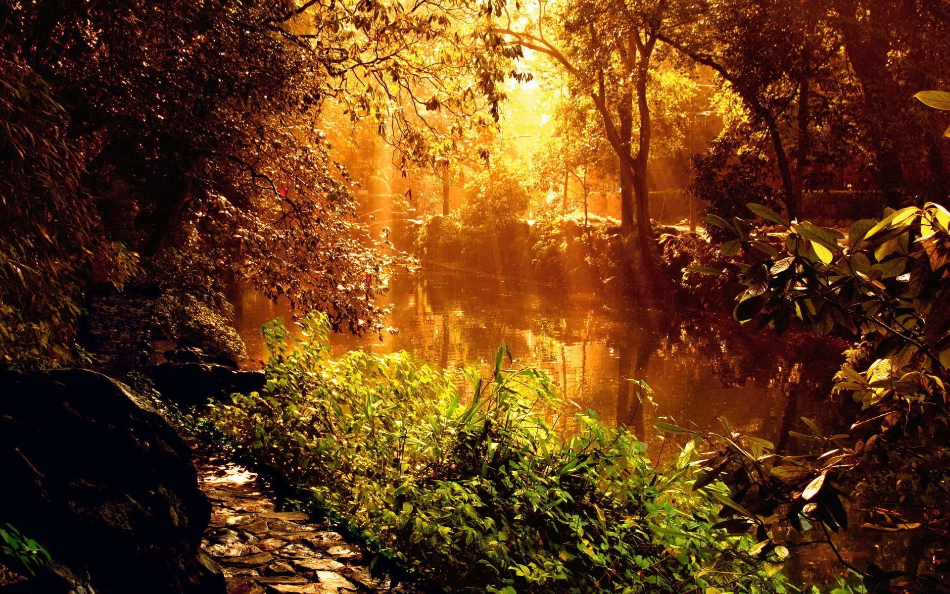 Il sole penetra attraverso il fogliame illuminando il fiume con i suoi raggi