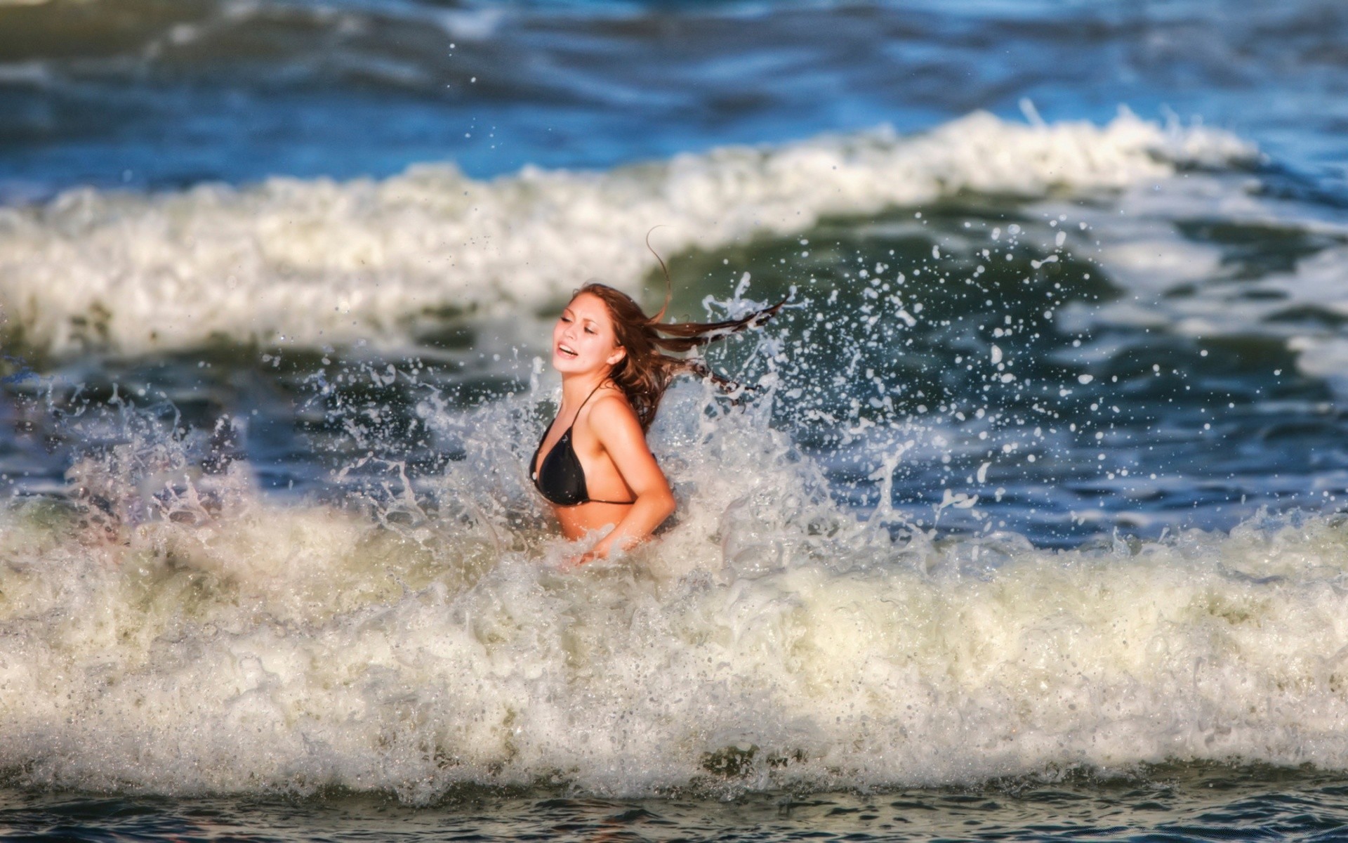 Bella ragazza in costume da bagno si trova in acqua