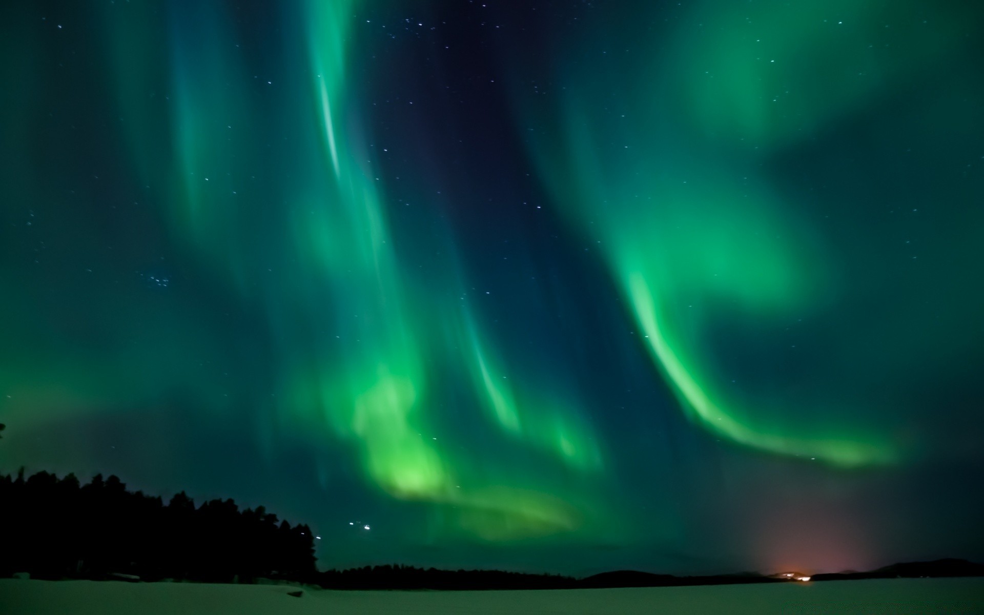 Paesaggio artico di un lago di montagna ghiacciato in coste innevate sotto il cielo con l'aurora boreale