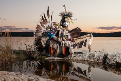Indiano con un corvo sulla testa e un uomo in una maschera nera