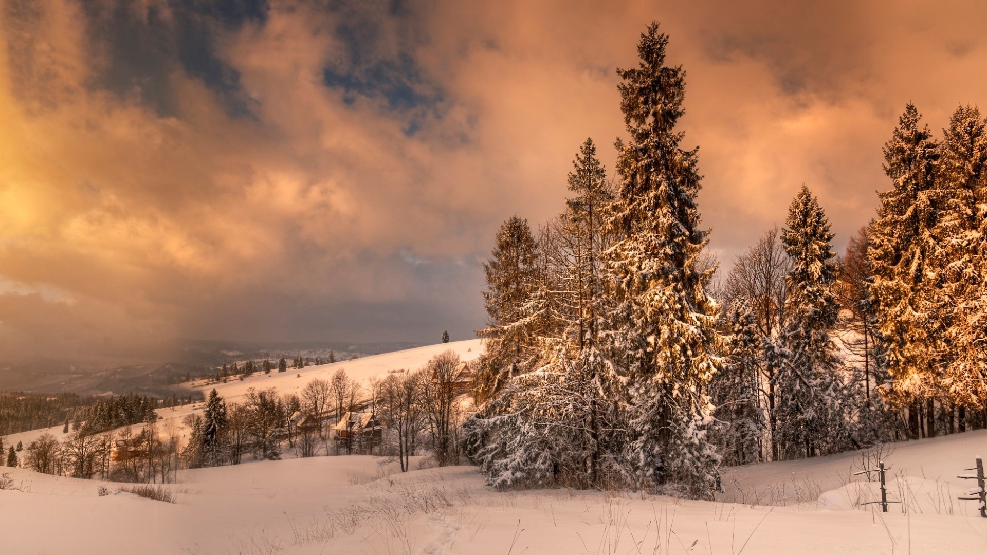 Cielo invernale e alberi di Natale nella neve