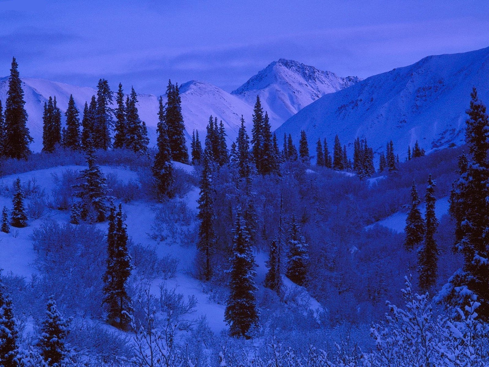 Paesaggio invernale, terreno montuoso e foresta di conifere