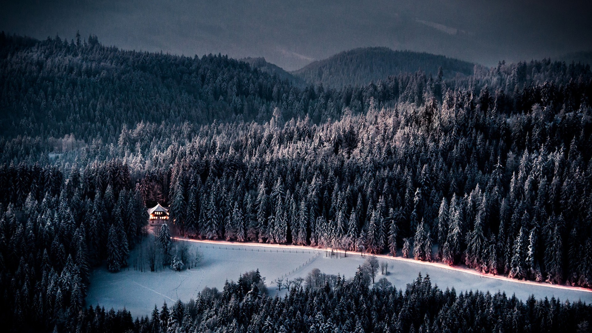 Paesaggio invernale. fiume, neve, foresta di conifere
