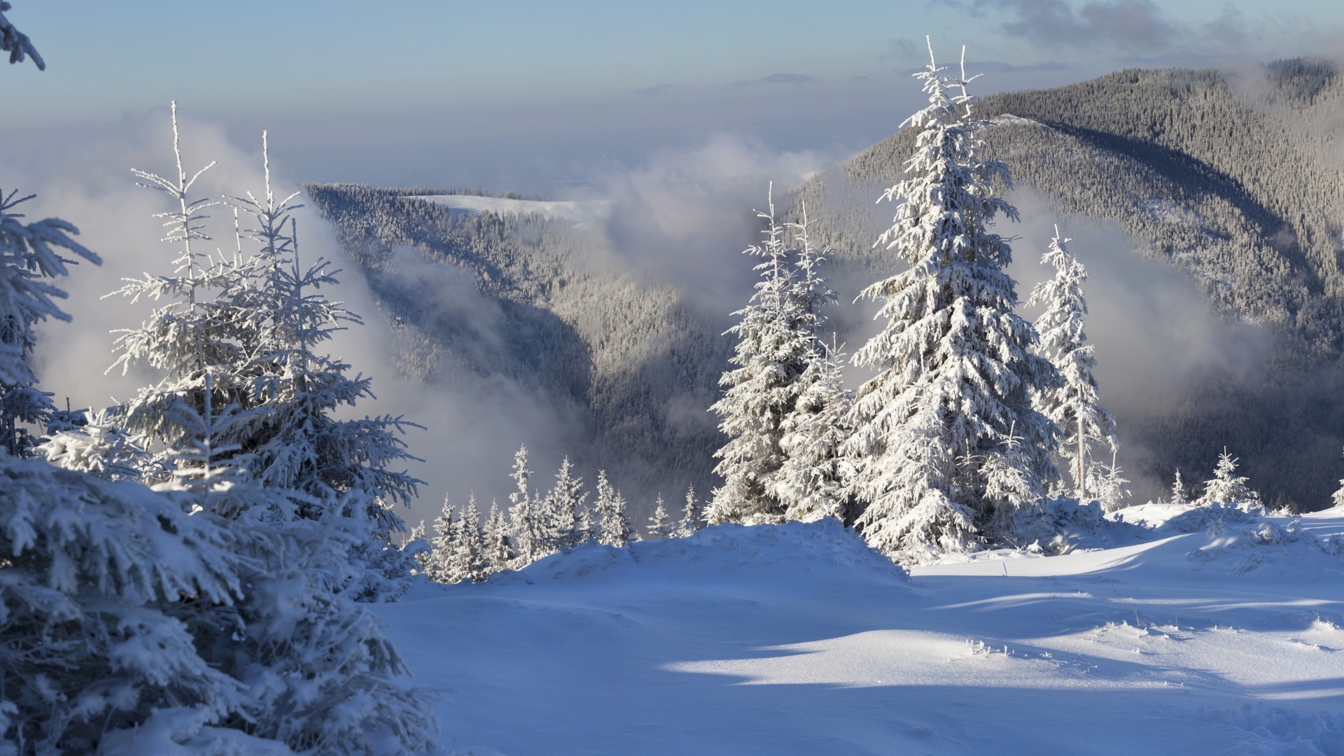 Alberi innevati in montagna in una soleggiata giornata invernale