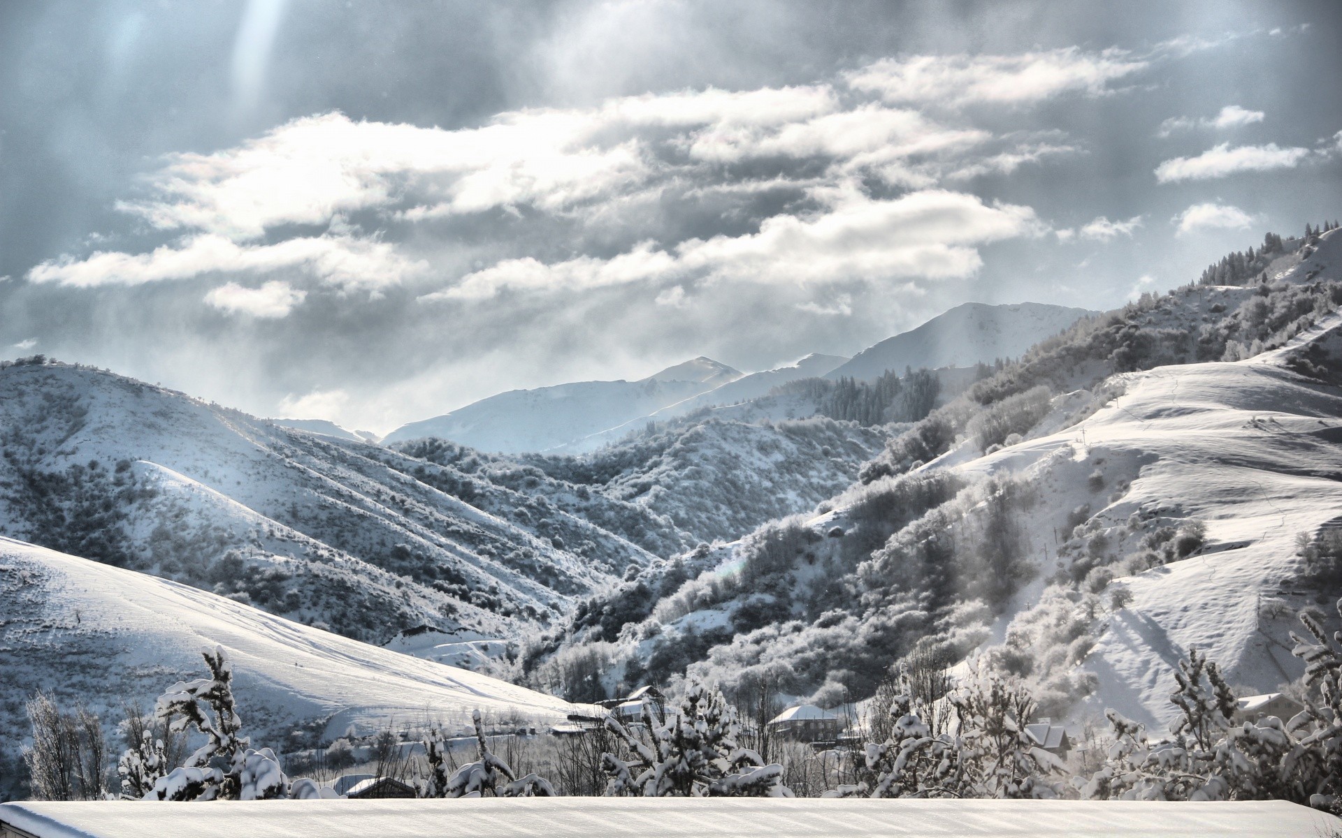 Paesaggio invernale. Gelo, montagne, sole splendente