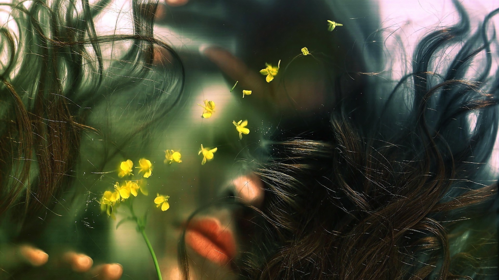 Foto con fiori e faccia sullo sfondo