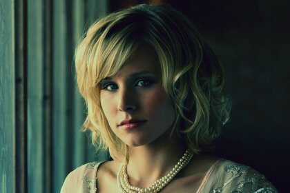Ragazza bionda con collana di perle e taglio di capelli corto