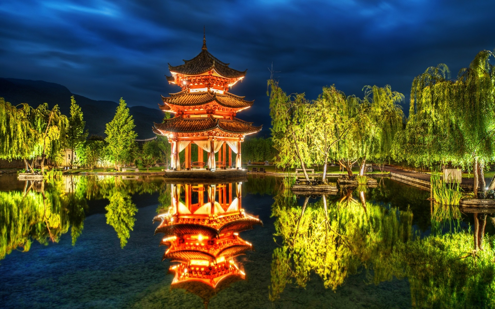 Paesaggio notturno. La Pagoda si riflette nel lago