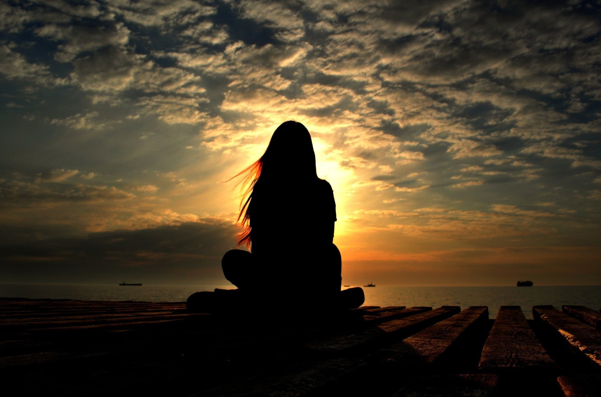 La sagoma della ragazza seduta nella posizione del loto ha chiuso il sole