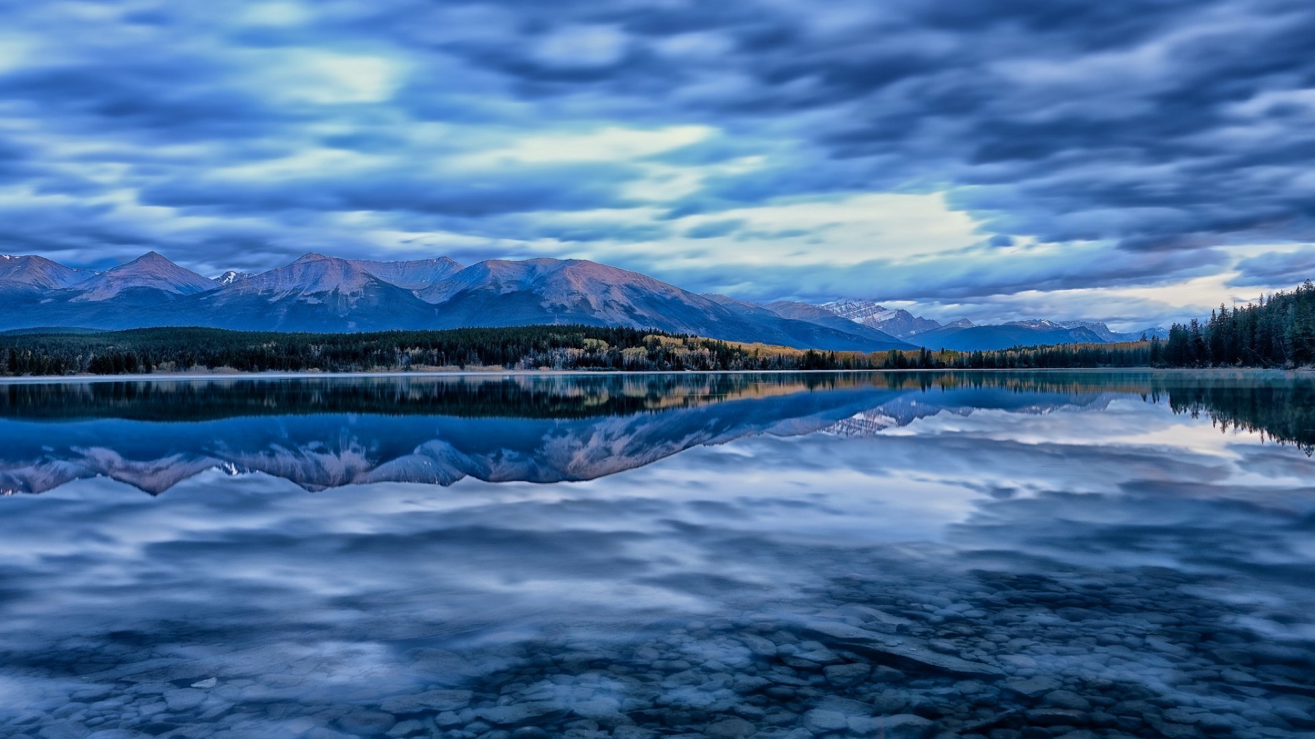 Il lago, il riflesso degli alberi in esso, il crepuscolo