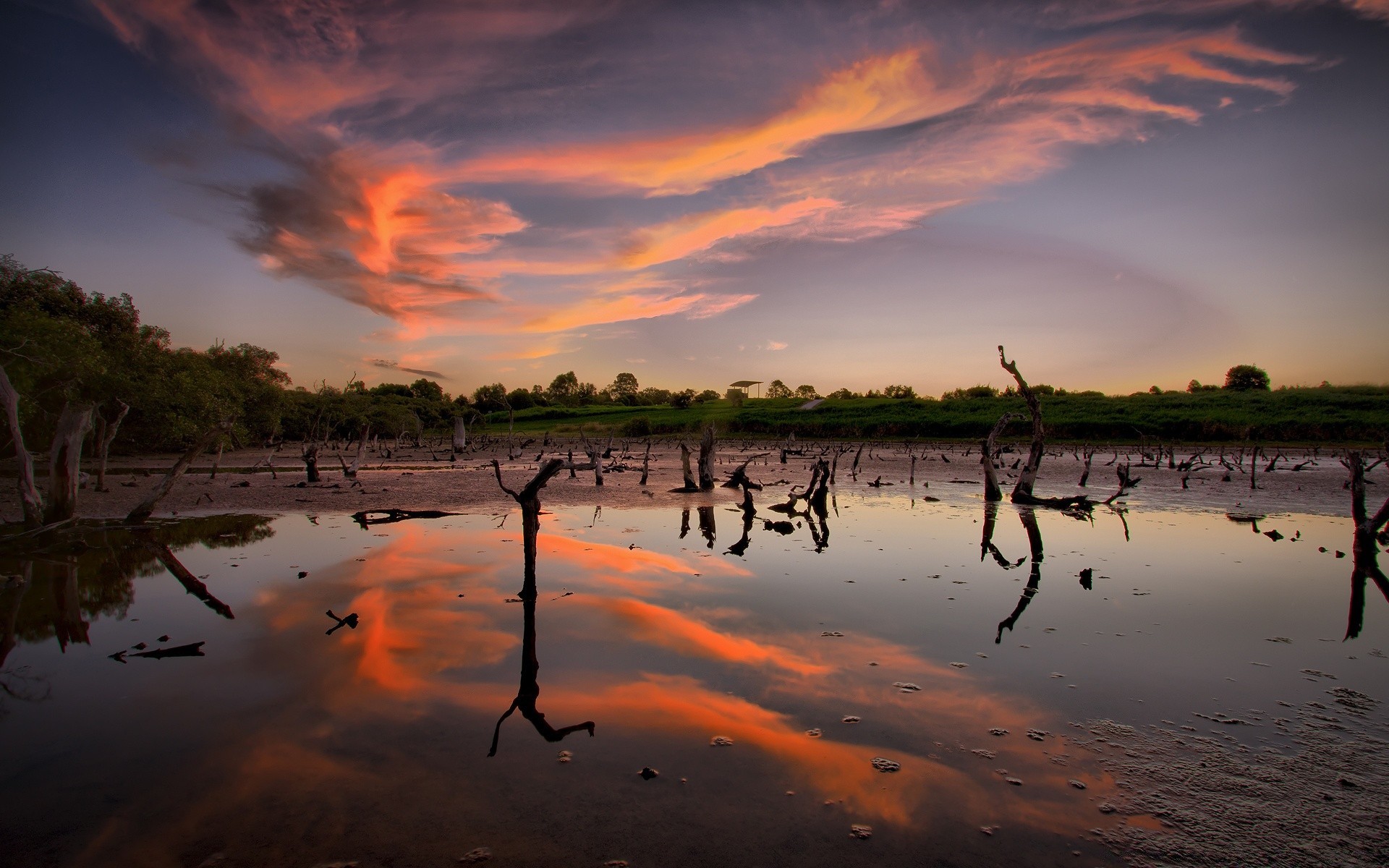Riflesso del cielo zaktny nel lago della foresta