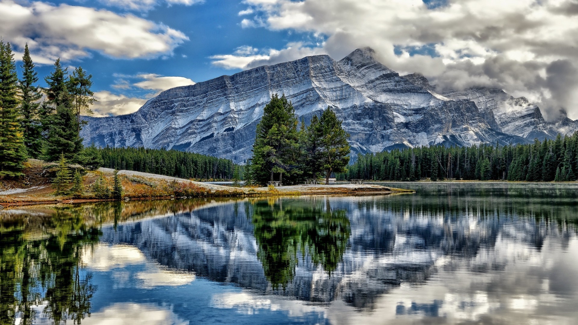 Paesaggio. lago in montagna, nuvole nel cielo e cime innevatePaesaggio. Lago in montagna, nuvole nel cielo e cime innevate