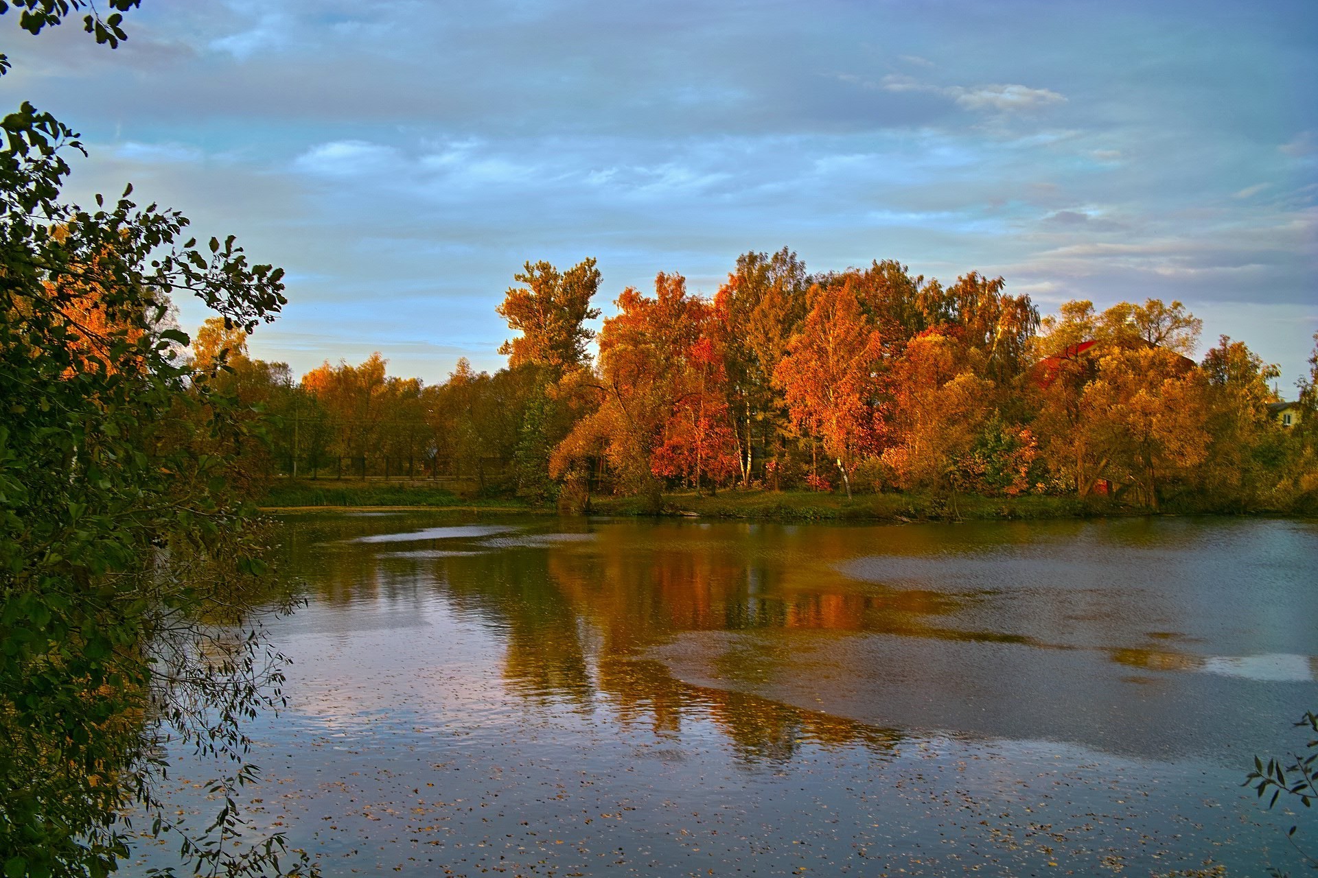 Il lago, il riflesso degli alberi in esso, il crepuscolo