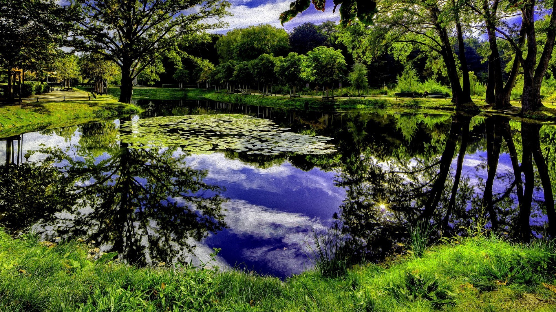 Paesaggio del lago al tramonto con il riflesso degli alberi