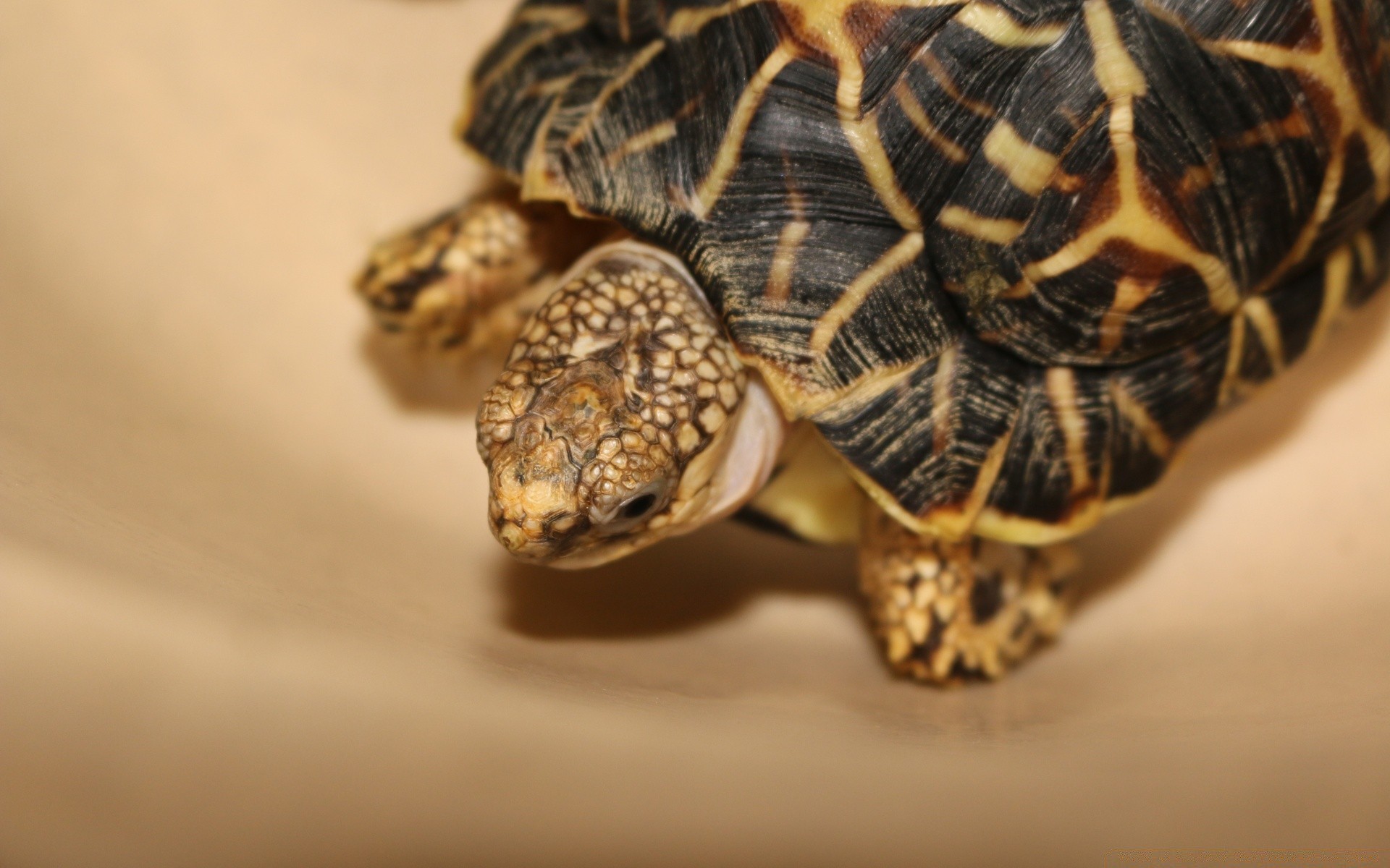 Primo piano di tartaruga su sfondo dorato sabbioso