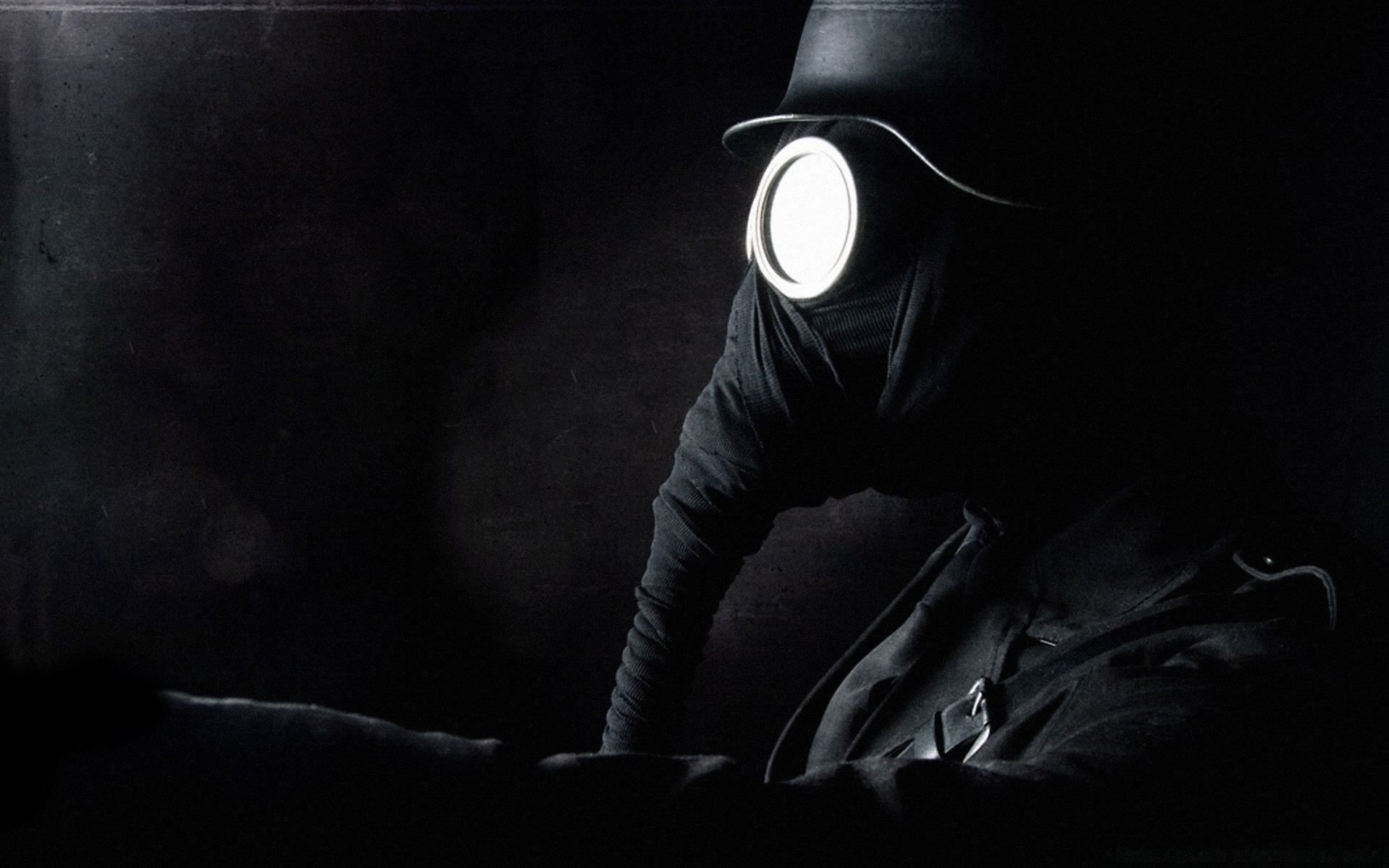 Foto in bianco e nero di un uomo mascherato su sfondo scuro