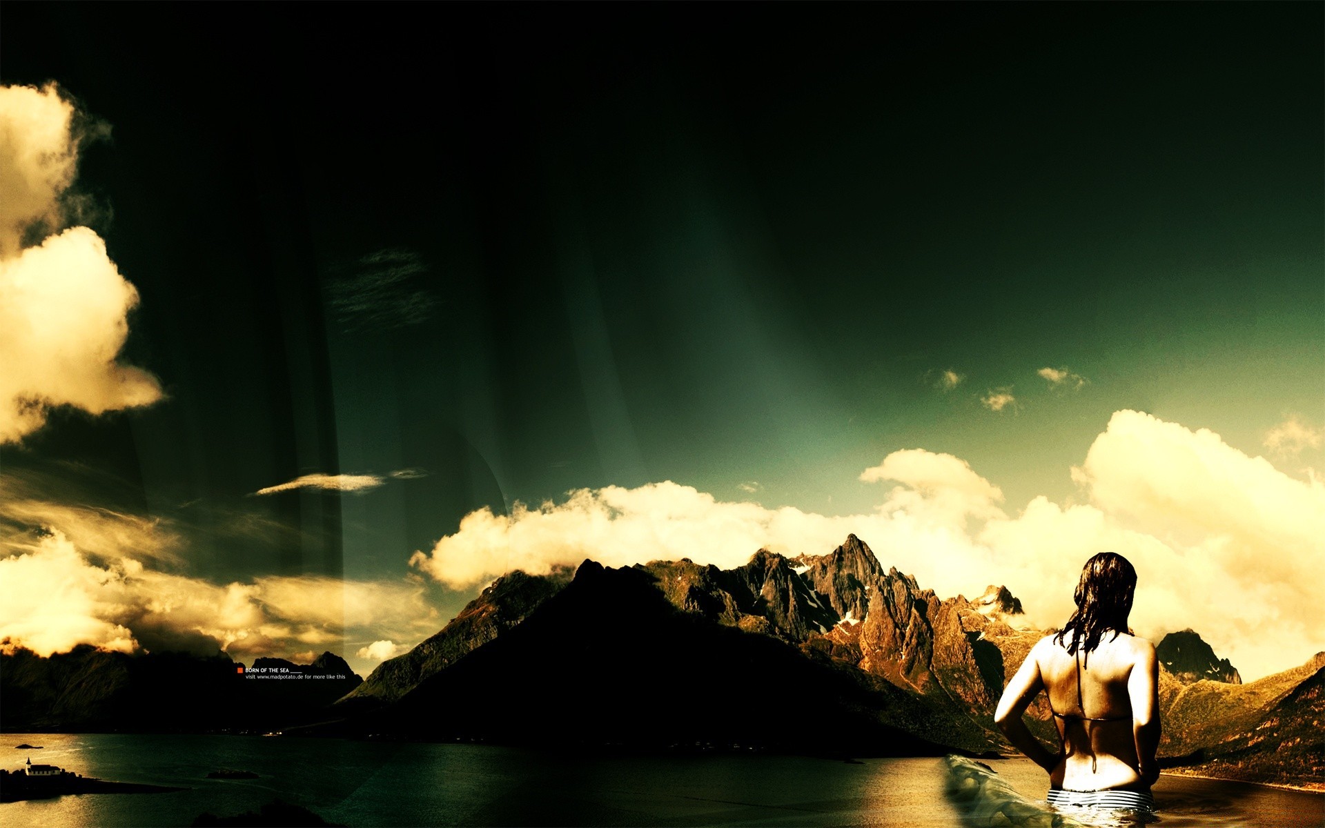 Ragazza in acqua sullo sfondo delle montagne
