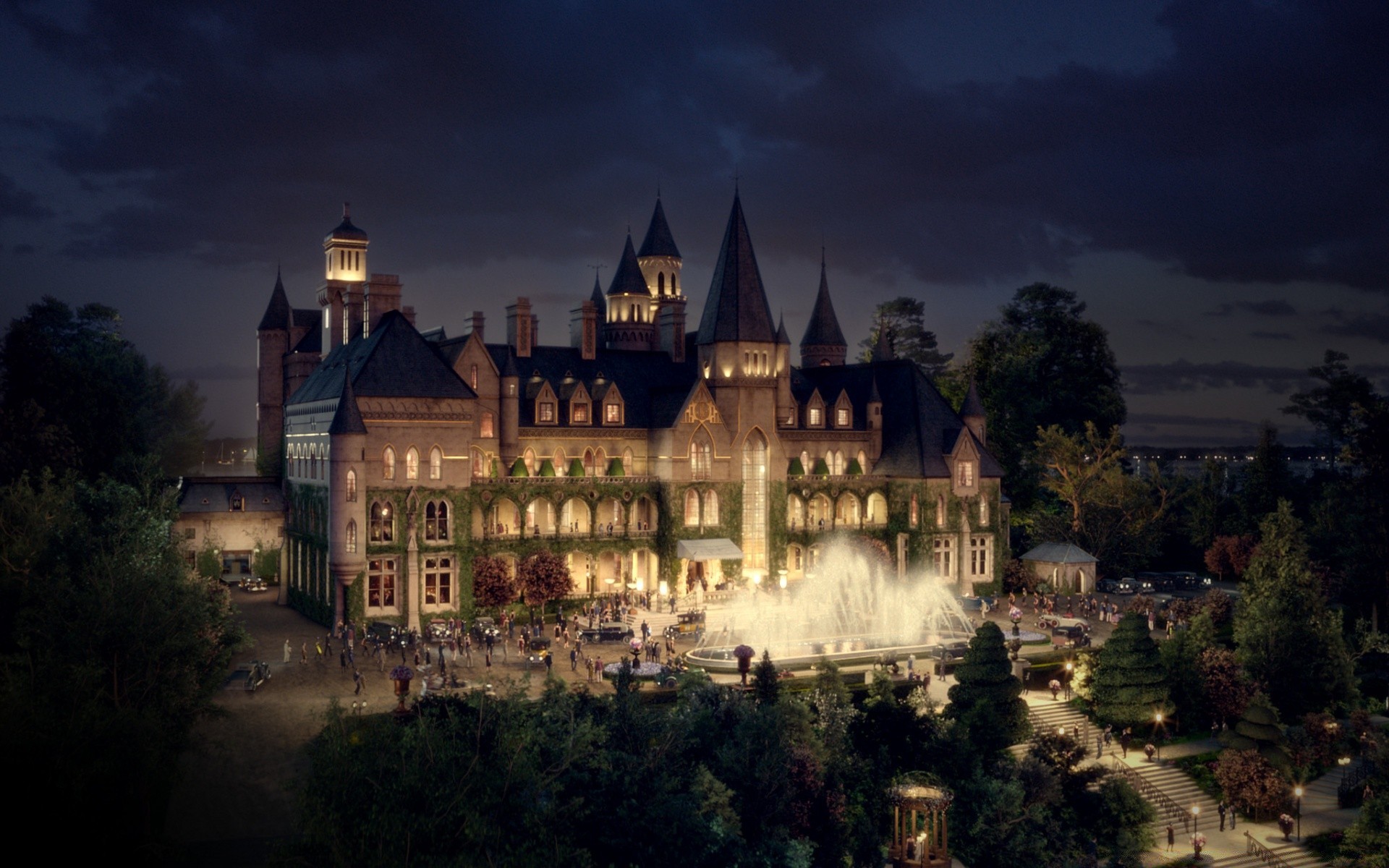Un antico castello notturno alla luce delle lanterne accoglie gli ospiti