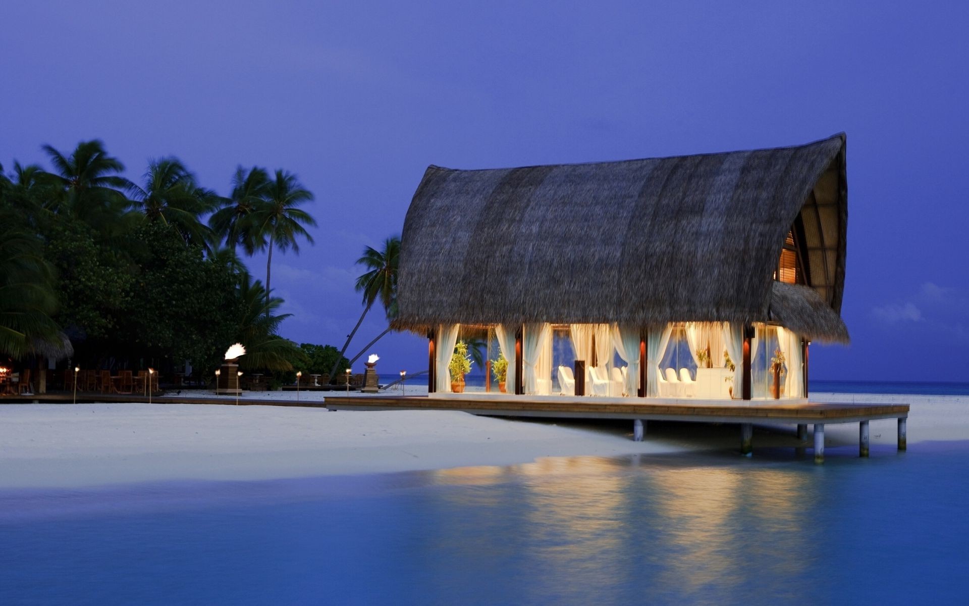 Cena per due in spiaggia sotto il tramonto in riva al mare
