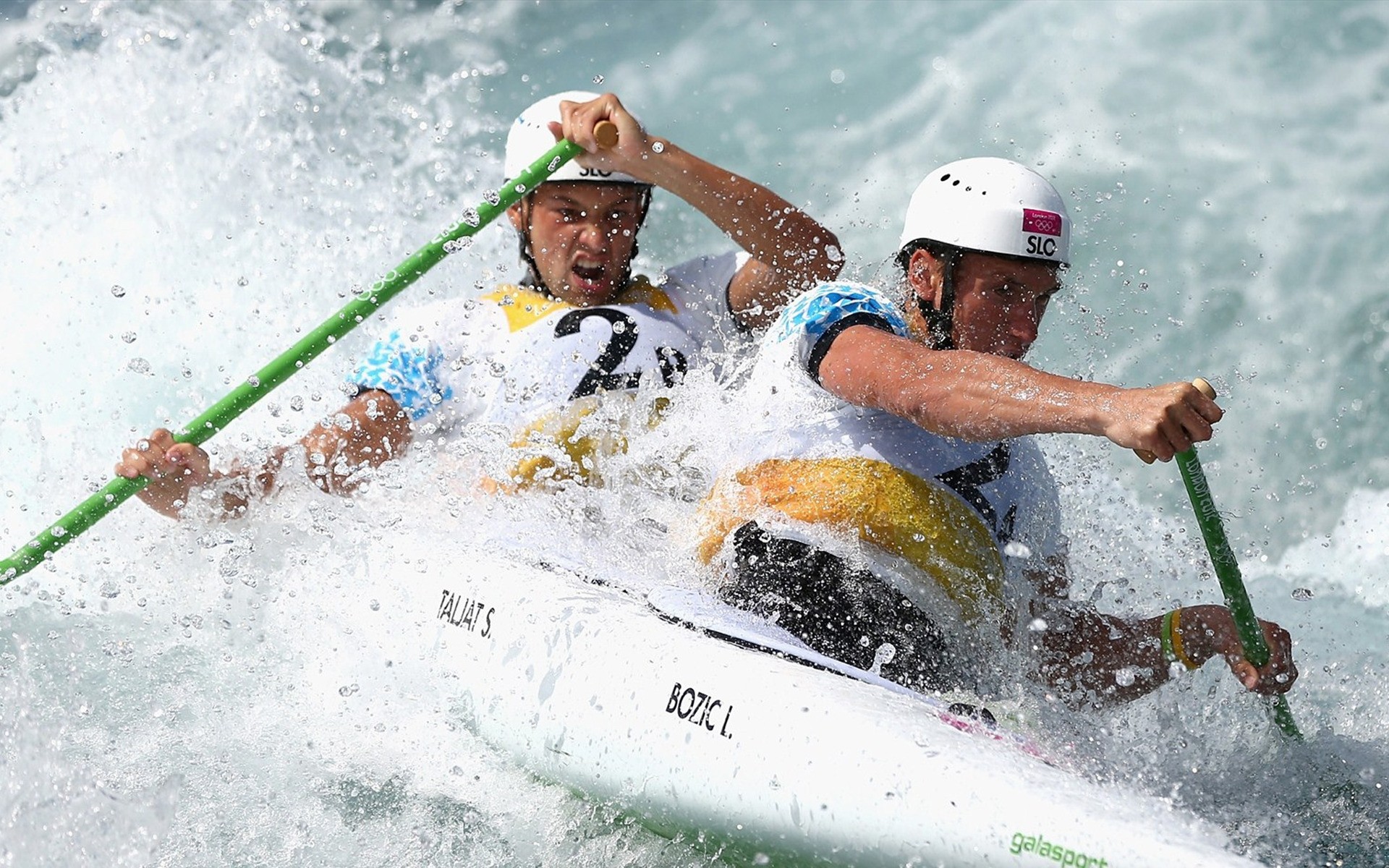 Kayak con due canoisti sezionando un flusso di acqua gorgogliante