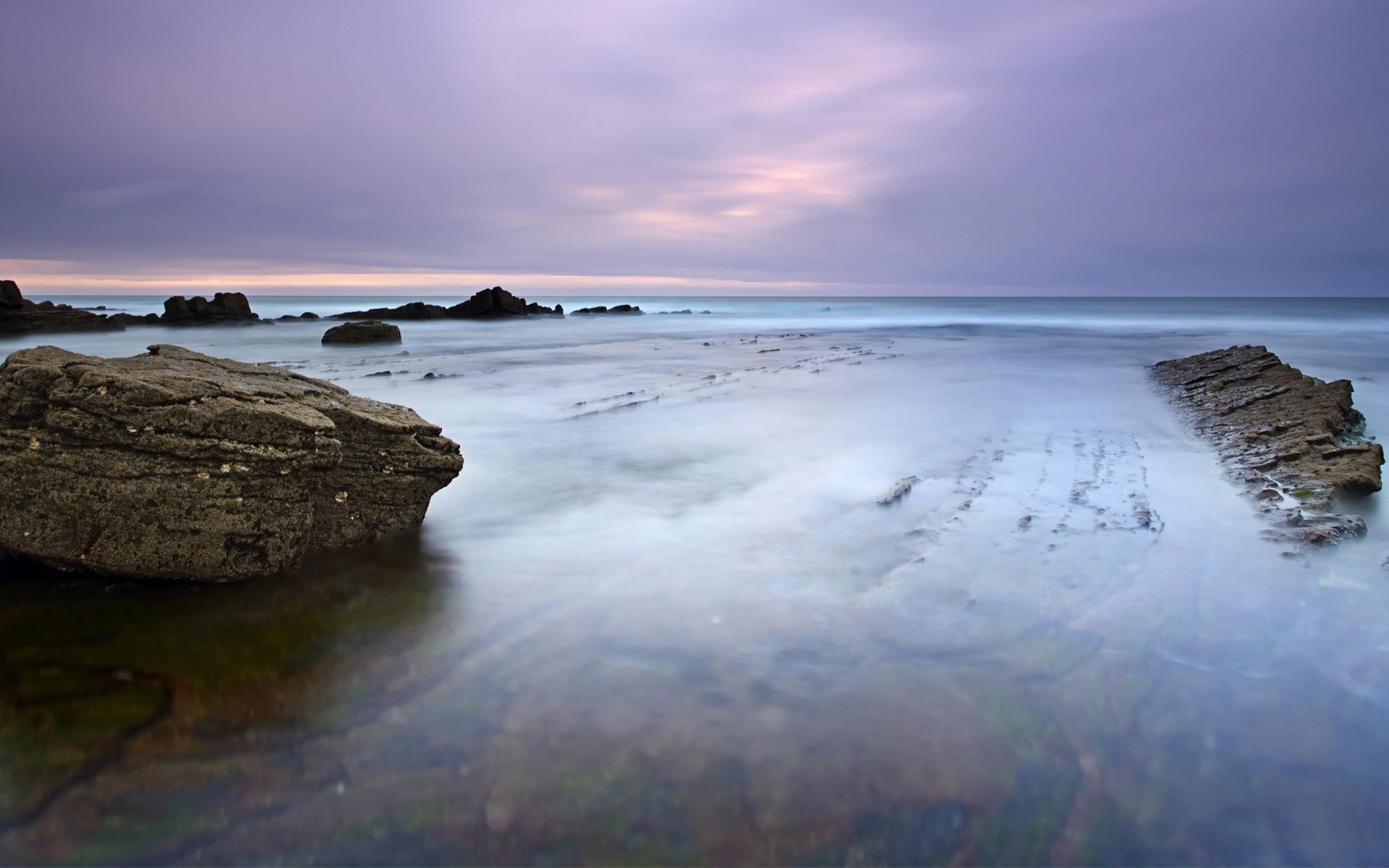 Nebbia lilla sulla foresta e sulle montagne al tramonto