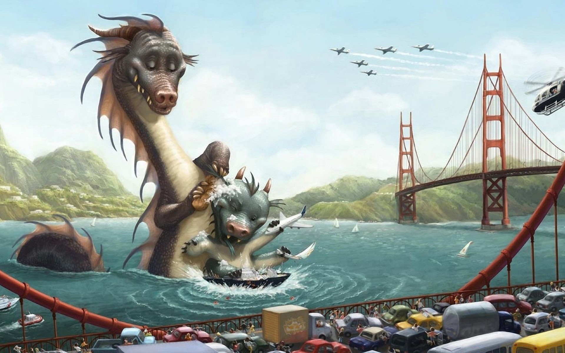 Una strana caricatura, due draghi giocano lì vicino a un lungo ponte
