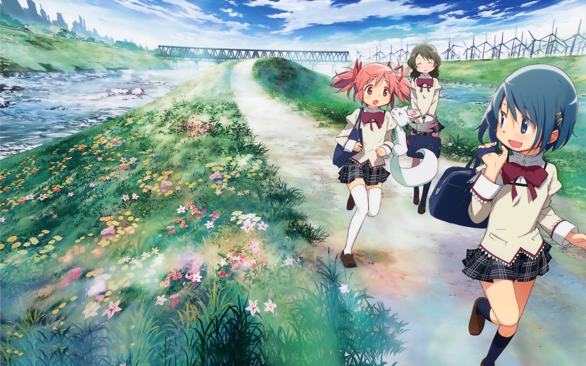 Tre piccole ragazze della scuola anime che corrono lungo la pistaTre piccole ragazze della scuola anime che corrono lungo la pista