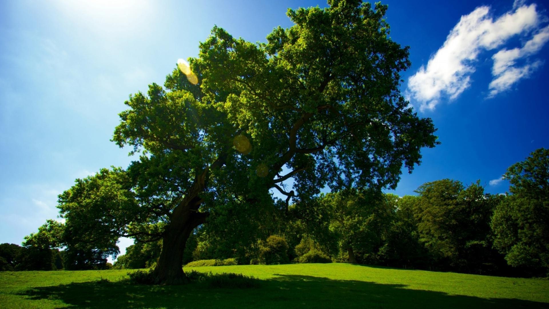Albero verde e cielo blu sul paesaggio estivo luminoso