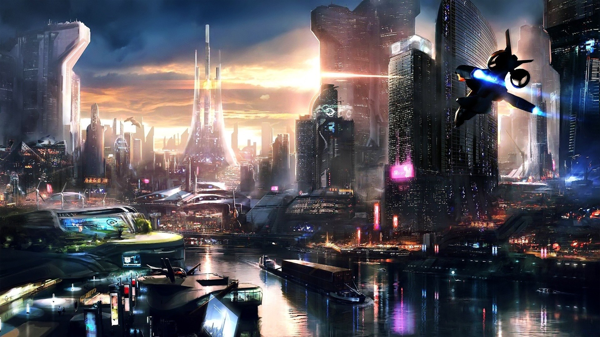 Città del futuro con macchine volanti