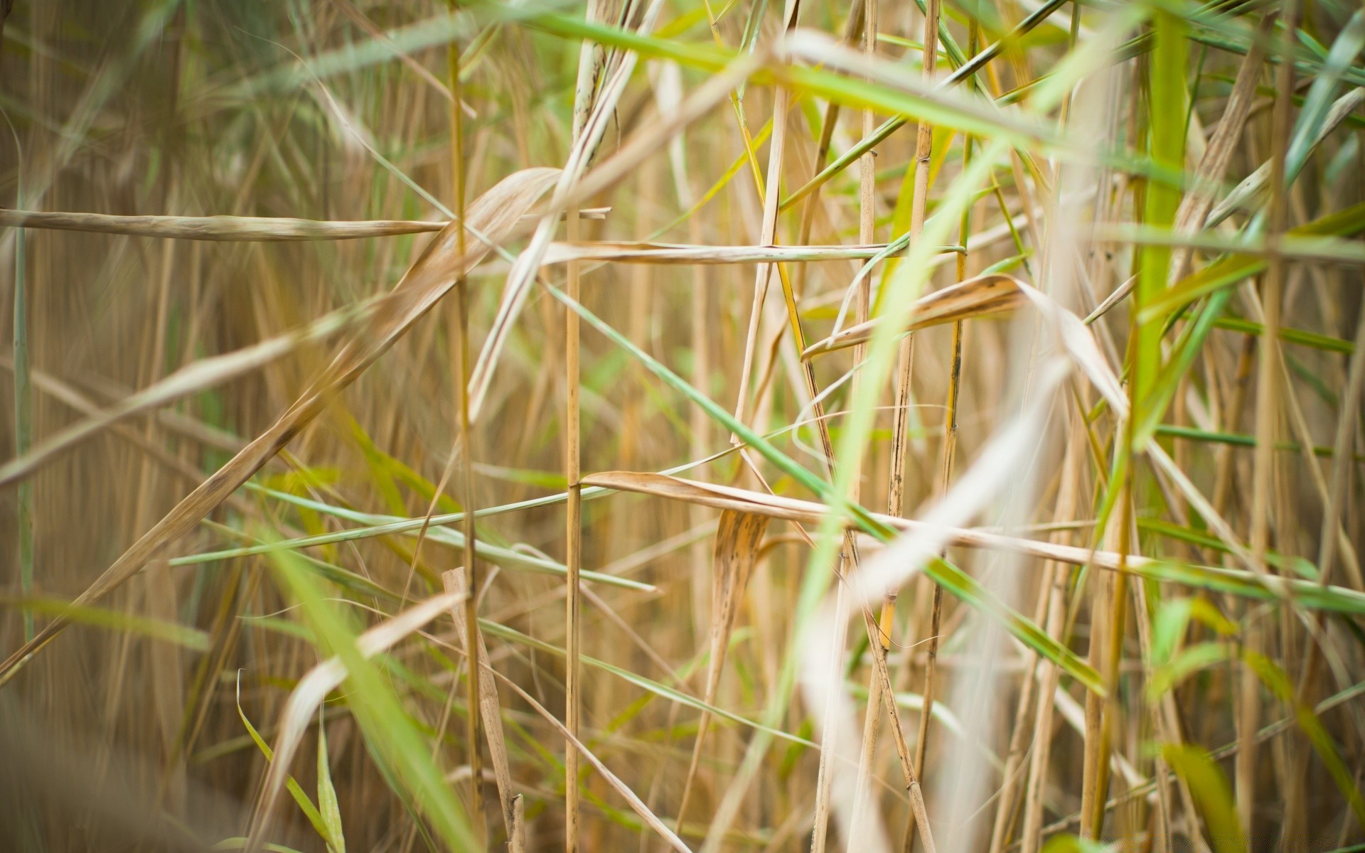 Riprese macro di un filo d'erba in un campo su uno sfondo sfocato