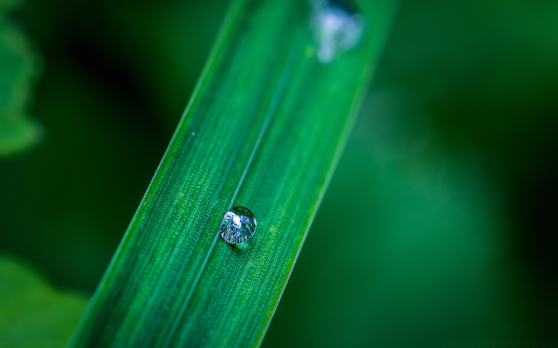 Fotografia macro di un filo d'erba verde decorato con gocce di rugiada