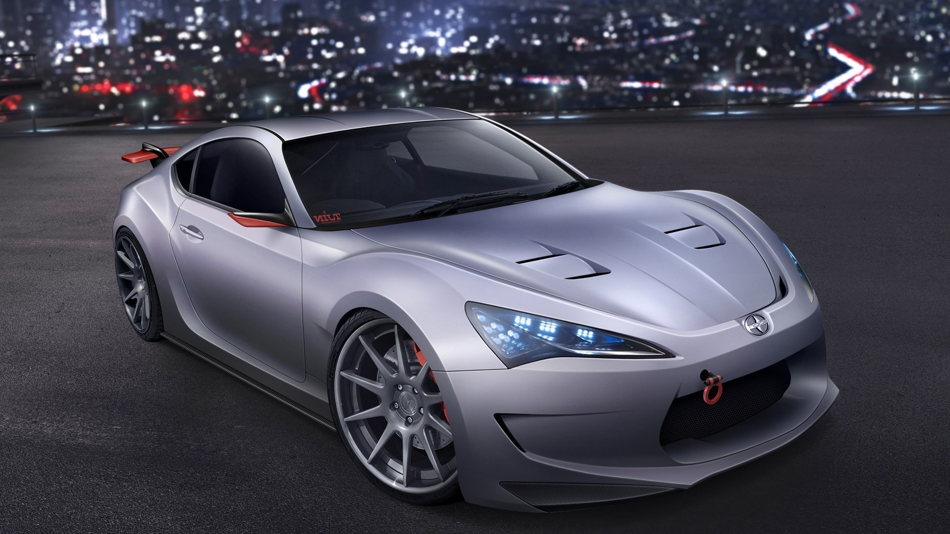 Un'auto sportiva argentata si trova sulla strada tra le verdi colline