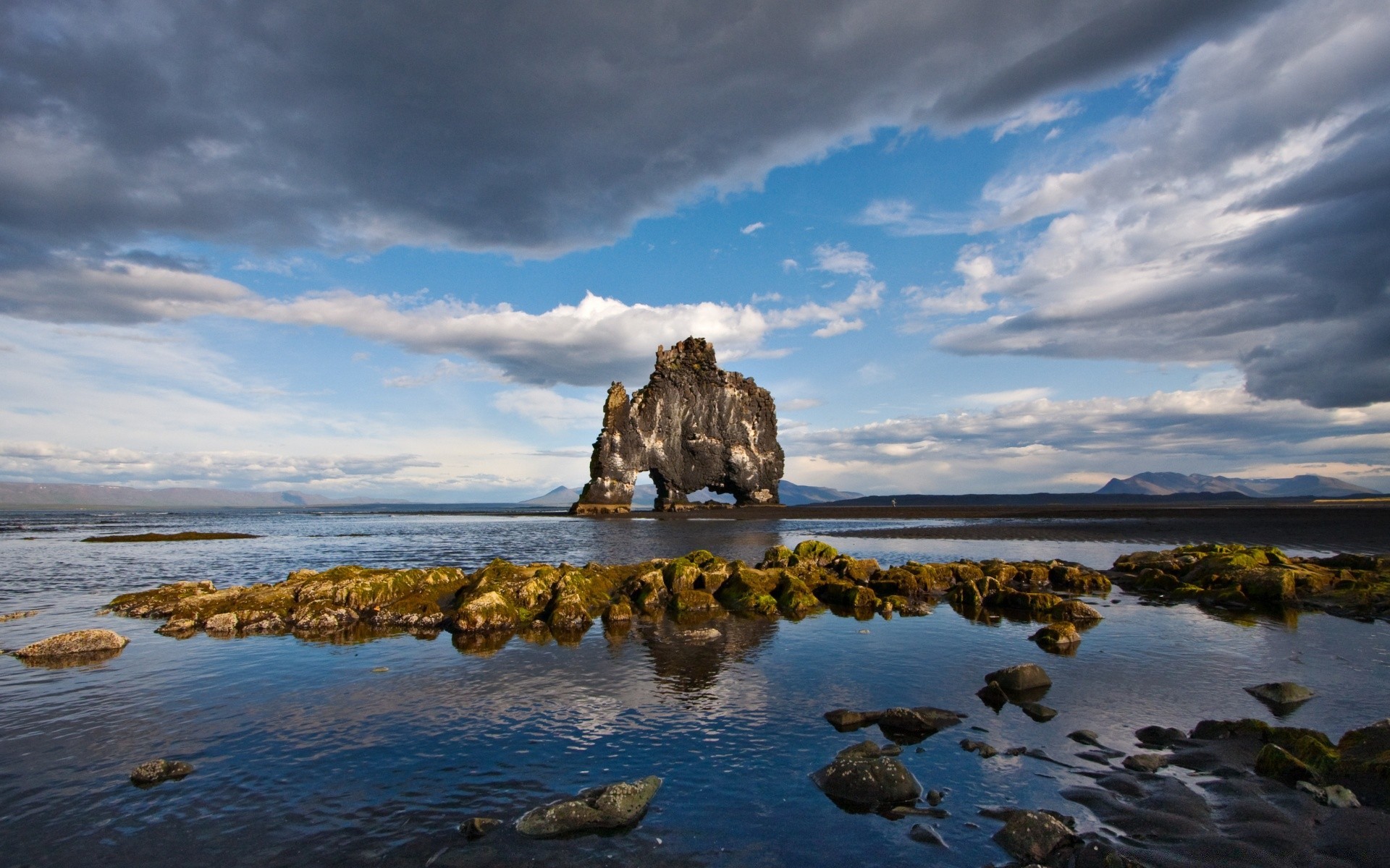 Spiaggia sabbiosa deserta bagnata dal mare sotto un cielo nuvoloso