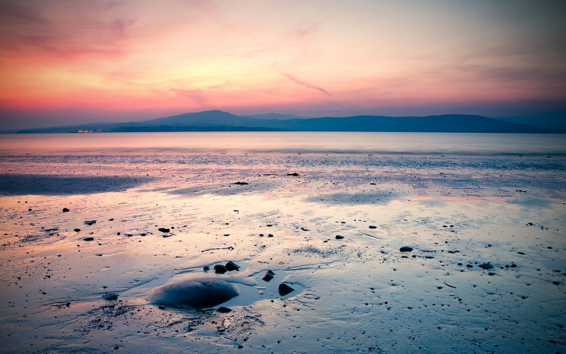 Spiaggia dell'oceano al tramonto con sabbia in colori gialli