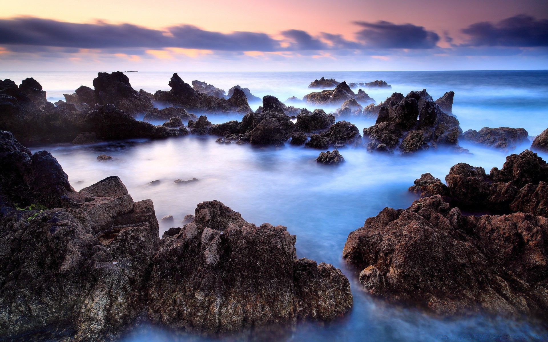 Mare nebbioso tra grandi rocce