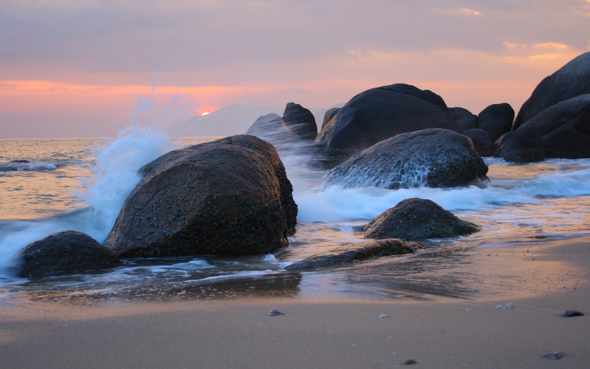 Una fredda Alba Marina illumina enormi rocce vicino alla riva