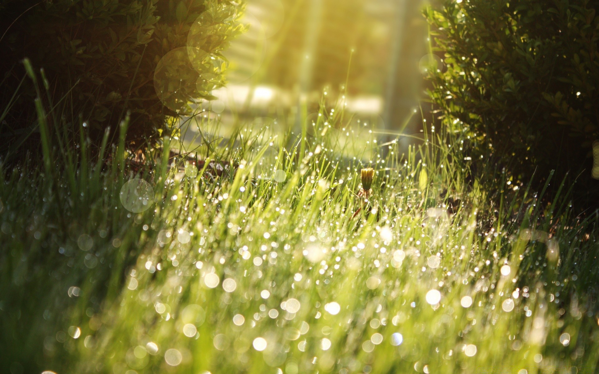 Gocce di rugiada sull'erba al sole di mezzogiorno