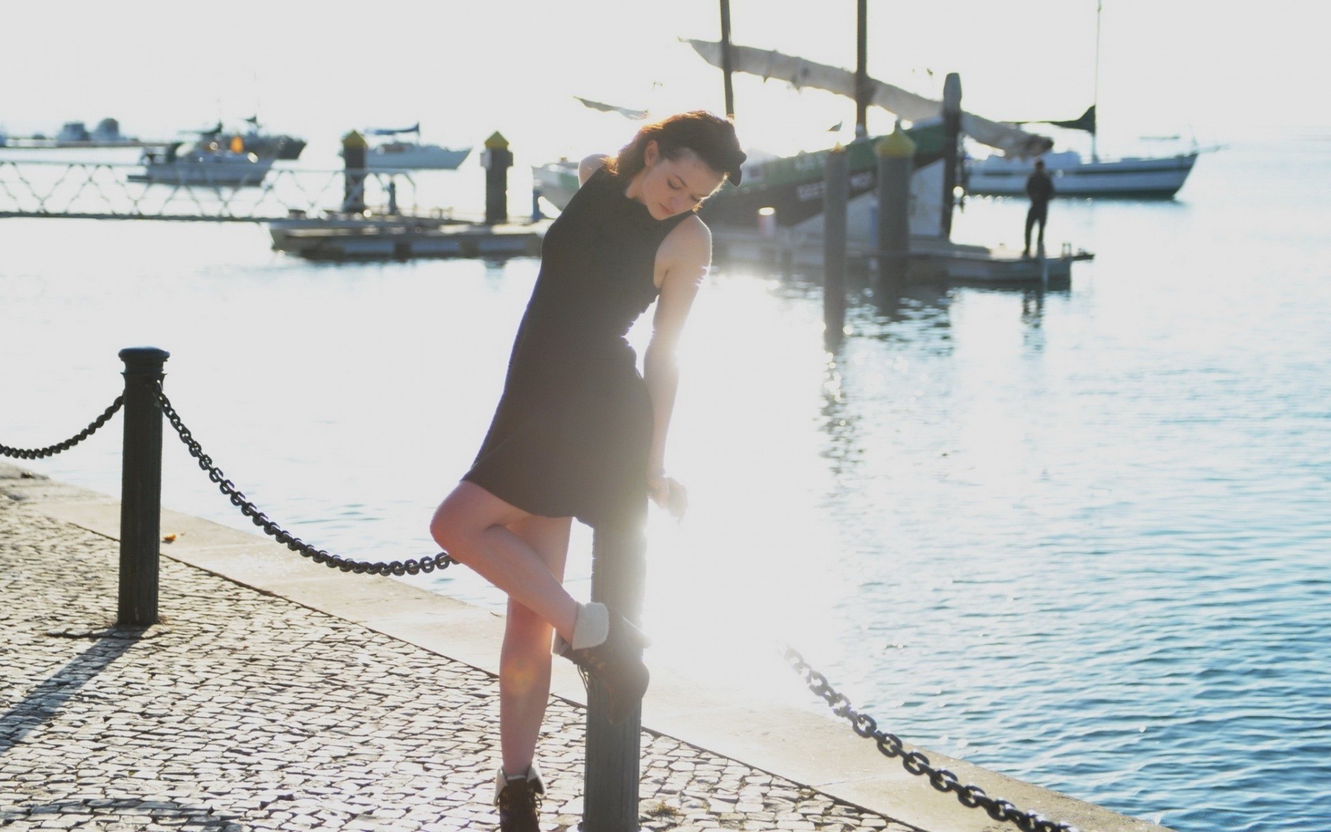 Una ragazza in un abito corto sul molo poggia su una colonna di metallo