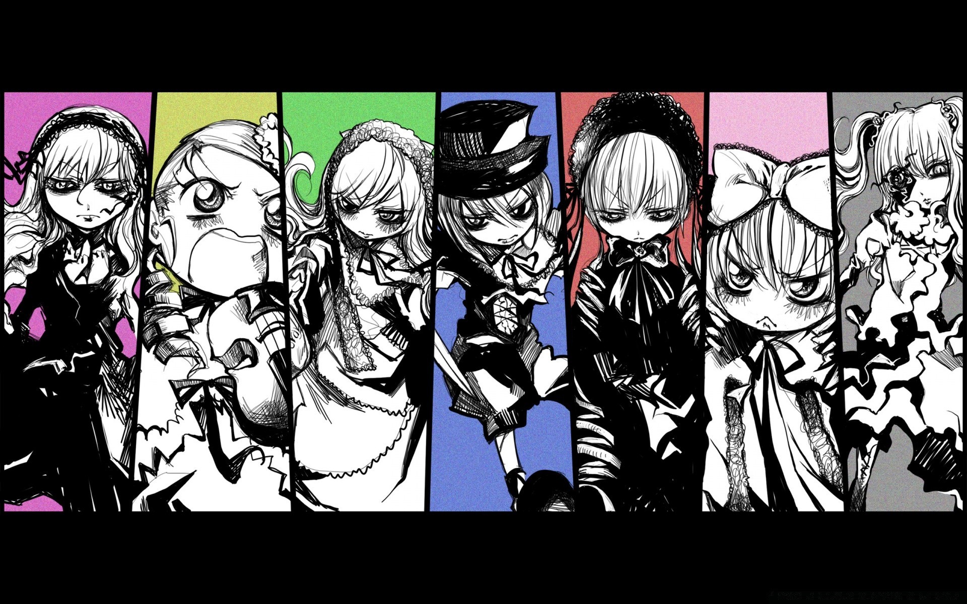 Anime in bianco e nero su sfondi colorati