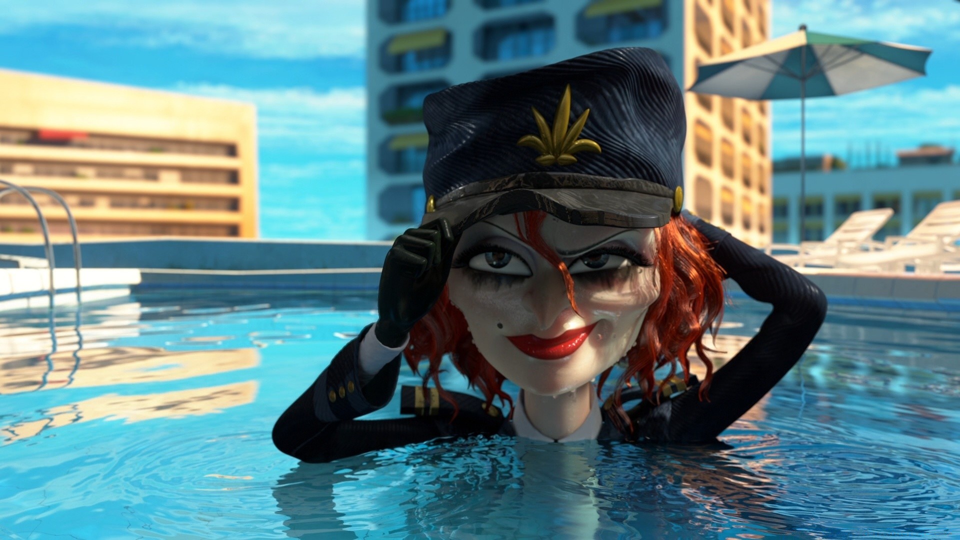 Eroina dei cartoni animati dai Capelli rossi delinquente in piscina. Redhead ragazza in un berretto